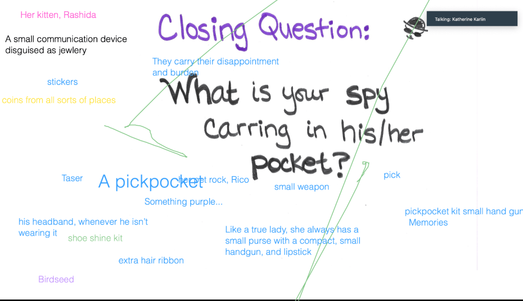 The young writers did an excellent job crafting their own spy backgrounds by adding vivid details and complexity. We met Paige’s “Bertie Jones” who likes to wear crazy socks and Stevie’s spy who recovers stolen paintings, lives in NYC, and is afraid of crowds.