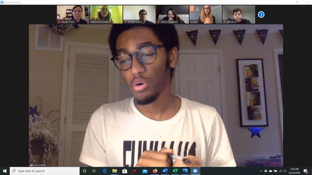 To strengthen that point, Winniebell shared an inspiring video performance of Maya Angelou’s “Still I Rise” with the group. She also worked with the young writers on their close reading skills with a large group close reading of Chen Chen’s “Self-Portrait as So Much Potential” followed by a small group close reading of Jericho Brown’s “Crossing.”