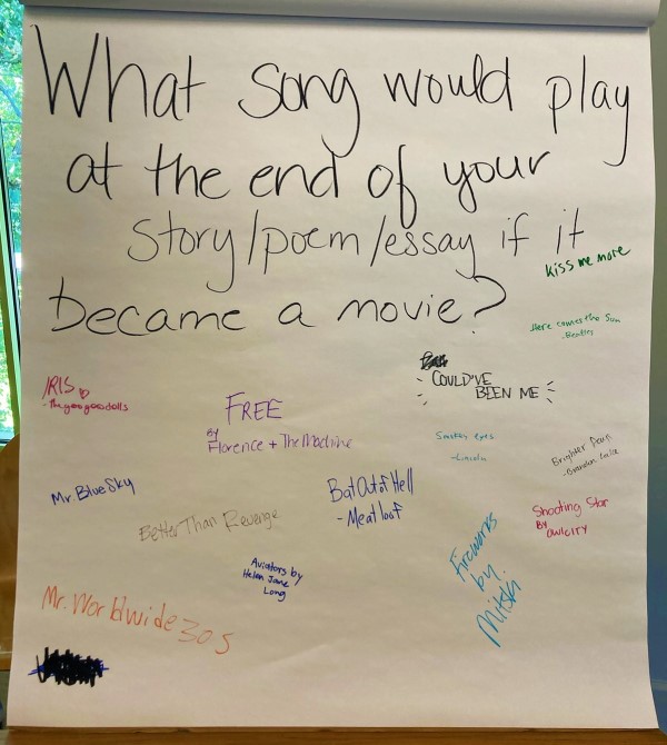 Finally, today’s closing question was another music prompt: What song would play at the end of your story/poem/essay if it became a movie? Check out the answers below!