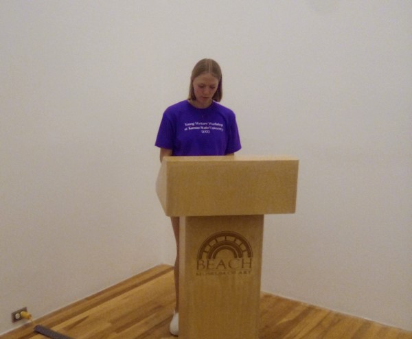 Finally, it was time for the reading! As family and friends began to arrive, excitement filled the air. In the intimate space on the second floor of the Beach Museum, the young writers showcased their work, accepted their certificates of completion, and received raucous rounds of applause.