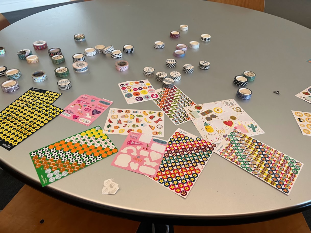 Next, young writers’ began decorating their writing journals for the week with an assortment of supplies, including lots of washi tape and fun stickers! As they were decorating, our three groups of young writers created their team names: The Amber Dragons, The Muffin Cats, and D.W.S. (Different Writer’s Society).