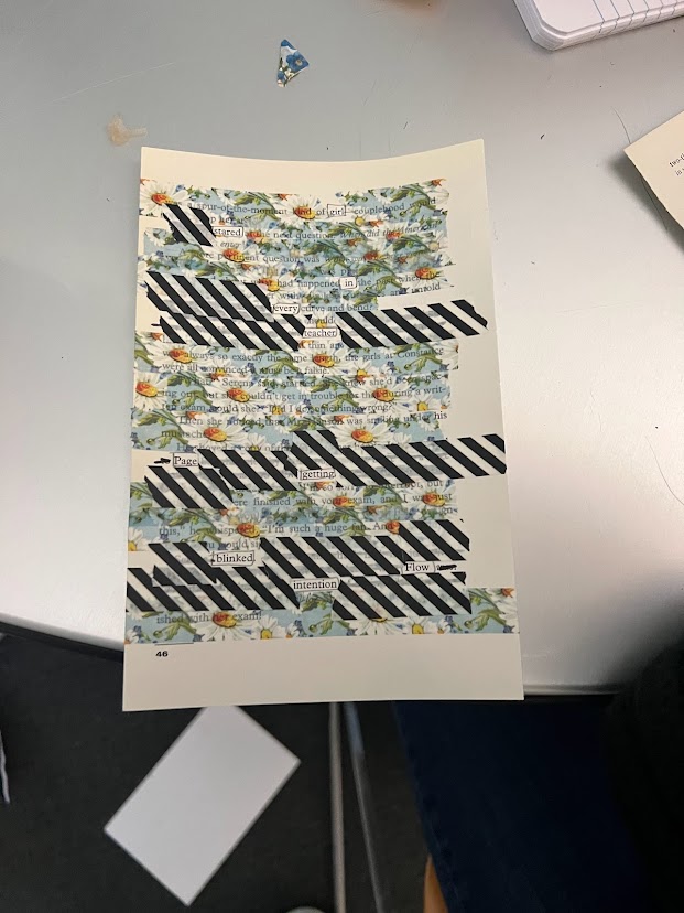 For their second blackout poem, they wrote “Hate Poems,” or anti-love poems. Finally, for their third blackout poem, they wrote a twenty-seven word love poem. The writers were so creative with their designs, drawing pictures and even using washi tape to block out words.