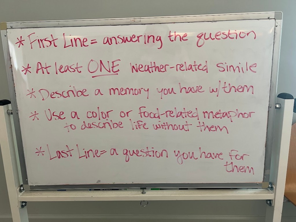 After a game of High School Mafia: 1992 Palm Springs Platypuses edition, the young writers turned their focus back to poetry with an activity led by Riley. To introduce epistolary writing, which comes from the word “epistle” (letter), Riley dropped “mail” off at each table. In each envelope, the table got a letter with an abstract concept or object asking a question. For example, one letter’s abstract concept was “Winter,” and the question Winter asked was “Don’t you think it’s cold?”. The young writers then created a response back to their abstract concept in a poetry form, including an answer to their concept’s question, one weather-related simile, a memory with the concept, a color or food-related metaphor to describe life without them, and a question for the concept.